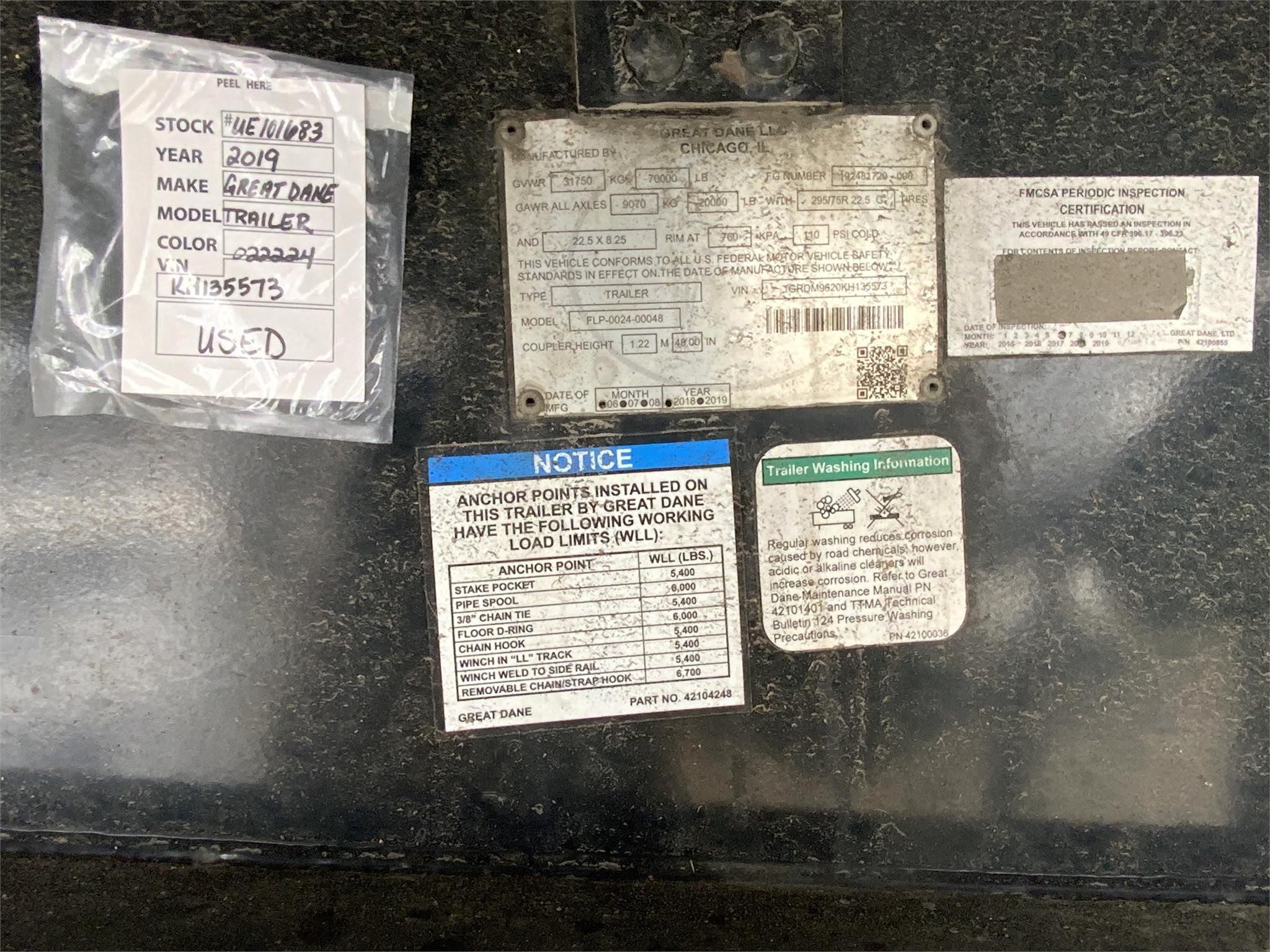 Location: Auburn, Condition: Used, Inventory Type: Trailers, Category: Semi Trailers – Flatbed Trailers, Year: 2019, Manufacturer: GREAT DANE, Model: FLP-0024-00048, Stock Number: UE101683, Zip/Postal Code: 98002, VIN: 1GRDM9620KH135573, Quantity: 1, Suspension: Air Ride, Tires: 295/75 R 22.5, Axle: Tandem, Length: 576, Width: 102, Composition: Aluminum